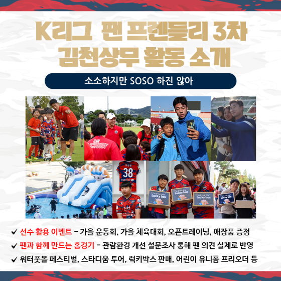 마지막으로 군 팀인 김천의 구조적 한계를 극복하고 국군체육부대와 끊임없는 소통을 통해 다양한 선수 활용 이벤트를 시행했다. 가을 운동회, 가을 체육대회, 오픈 트레이닝 등 팬 니즈 충족을 위한 다양한 노력으로 팬 만족도를 높였다.