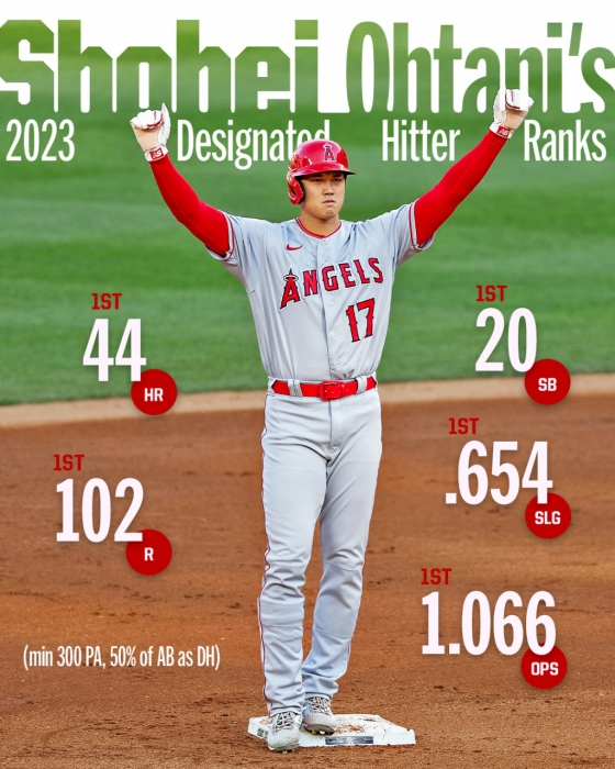 올해로 메이저리그 6년 차를 맞이한 오타니는 2023시즌에도 투수와 타자를 겸업하며 역대급 활약을 펼쳤다. 2023시즌 오타니는 타자로 135경기에 출장해 타율 0.274(497타수 151안타) 44홈런 2루타 26개, 3루타 8개, 95타점 102득점 91볼넷 143삼진 20도루 출루율 0.304 장타율 0.654 OPS 1.066의 빼어난 성적을 거뒀다. 장타율과 OPS는 커리어 하이 기록. 홈런 역시 2021시즌 기록(46개)에 단 2개 모자란 44개를 쏘아 올렸다. 출루율, 장타율, 총 출루 수(325출루) 모두 1위. 아울러 메이저리그 전체 OPS 1위라는 기록과 함께 생애 첫 아메리칸리그 홈런 1위 자리를 차지했다. 오타니의 타자 커리어 성적은 타율 0.274(2483타수 681안타) 2루타 129개, 3루타 29개, 171홈런, 437타점 428득점 351볼넷 755삼진 86도루, 출루율 0.366, 장타율 0.556, OPS 0.922.