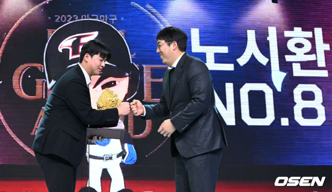 노시환은 1일 서울시 용산구 한남동 그랜드 하얏트 호텔에서 열린 사단법인 한국프로야구선수협회가 개최하고 국내 프로야구선수가 직접 참여해 수상자를 뽑는 선수들의 시상식 '2023 마구마구 리얼글러브 어워드'에서 영예의 올해의 선수상을 수상했다.