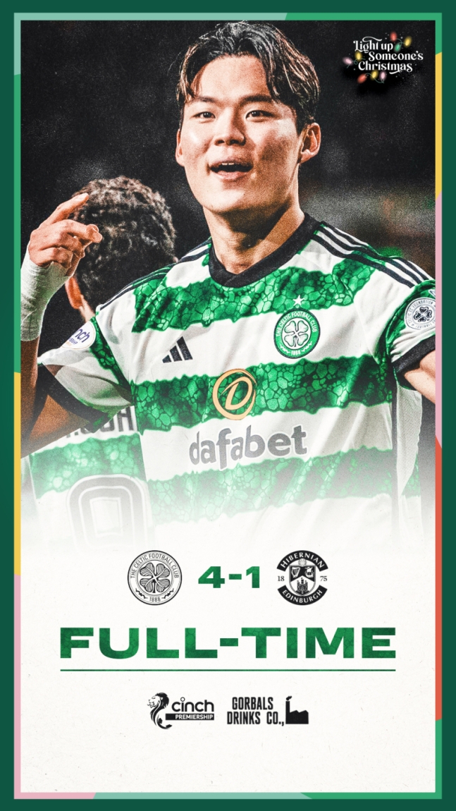 셀틱은 7일 오전 4시 45분(한국시간) 스코틀랜드 글래스고에 위치한 셀틱 파크에서 치러진 하이버니언과의 2023/24시즌 스코티시 프리미어리그(SPL) 16라운드 경기에서 4-1 대승을 거뒀다.