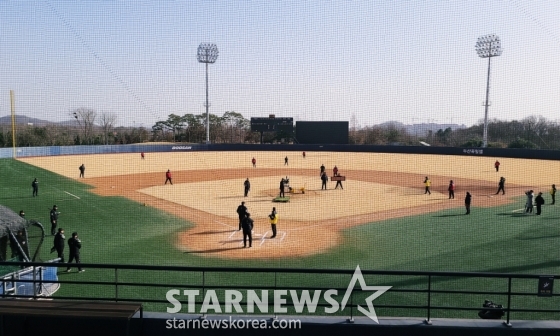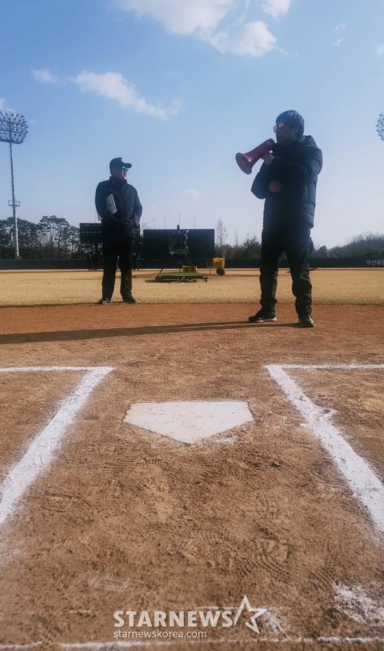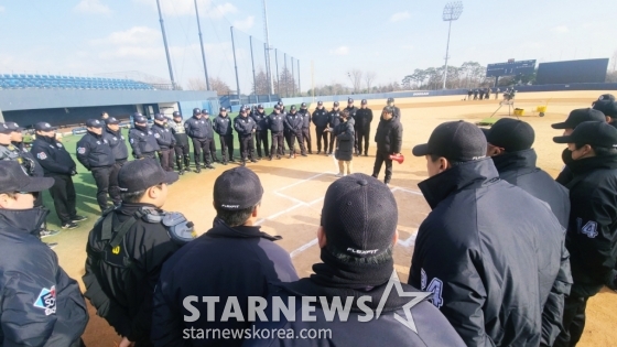 7일 다소 쌀쌀한 날씨 속 KBO 심판위원들은 우렁차게 "스트라이크" 콜을 외치는가 하면, 박수를 치며 서로를 독려했다. 허운 심판위원장이 메가폰을 손에 잡은 채 상황에 따라 미션을 부여하며 훈련을 진두지휘했다.