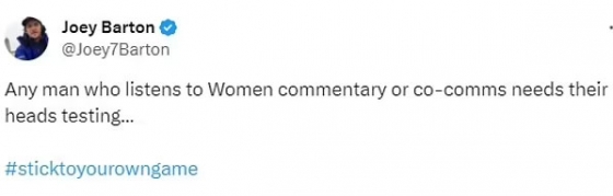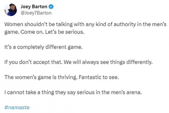 바튼은 트위터에 “여자들은 남자 경기에서 어떤 종류의 권위도 가지고 이야기해서는 안 된다. 완전히 다른 경기다. 그걸 받아들이지 않는다면 나와는 관점이 다를 수밖에 없다. 현재 여자 축구가 발전하고 있는 모습은 아주 환상적인 일이라고 생각한다. 하지만 남자 경기에서 그들이 하는 말은 하나도 진지하게 받아들일 수 없다”라고 밝혔다.