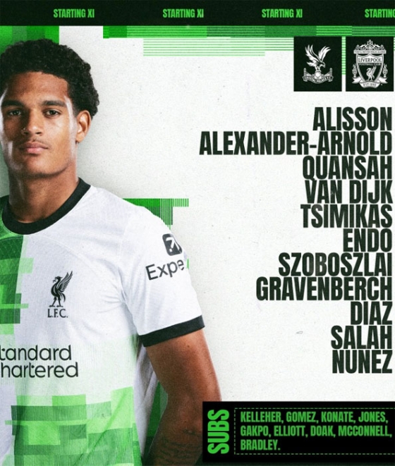 경기를 앞두로 리버풀은 선발 라인업을 공개했다. 리버풀은 4-3-3 포메이션으로 나왔다. 공격진에는 디아스-누녜스-살라가 출전한다. 미드필더로는 소보슬러이-엔도-흐라번베르흐가 나온다. 수비진에는 치미카스-반다이크-퀸사-아놀드, 골키퍼에는 알리송이 출전한다.