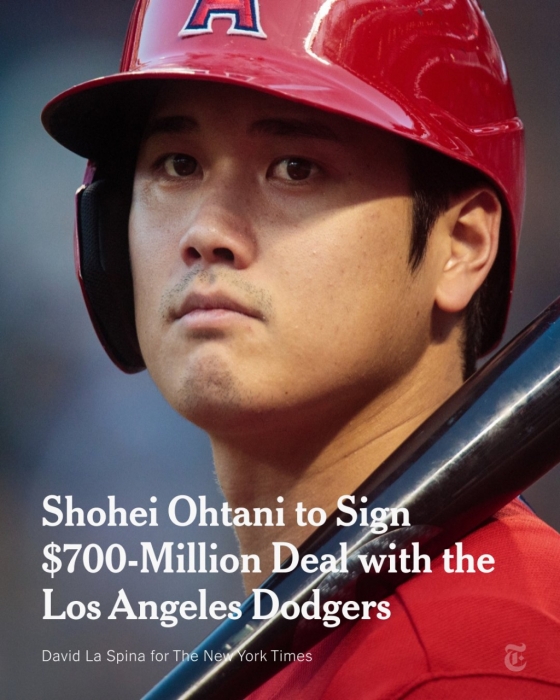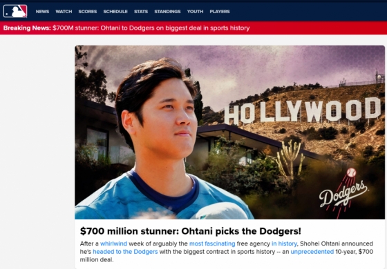 결국 오타니의 최종 선택은 LA 다저스였다. 계약 규모는 무려 7억 달러(한화 약 9240억 원)에 달한다. 미국 메이저리그 공식 홈페이지 MLB.com과 뉴욕 타임스, 디 애슬레틱 등 미국 주요 매체들은 같은 날 일제히 "오타니가 LA 다저스와 10년 7억 달러 계약을 맺었다"고 보도했다. 이는 북미 프로스포츠 사상 역대 최고 규모의 계약이다.