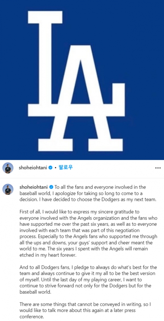오타니 쇼헤이는 10일(한국시간) 오전 직접 개인 SNS(소셜네트워크서비스)를 통해 LA 다저스의 로고를 올린 뒤 "모든 팬과 야구계 모든 관계자에게, 결정을 내리는 데 있어서 너무 오랜 시간이 걸린 것에 대해 죄송하게 생각한다(To all the fans and everyone involved in the baseball world, I apologize for taking so long to come to a decision)"면서 "저는 제가 뛸 다음 팀으로 다저스를 선택하기로 결정했다(I have decided to choose the Dodgers as my next team)"고 밝혔다.