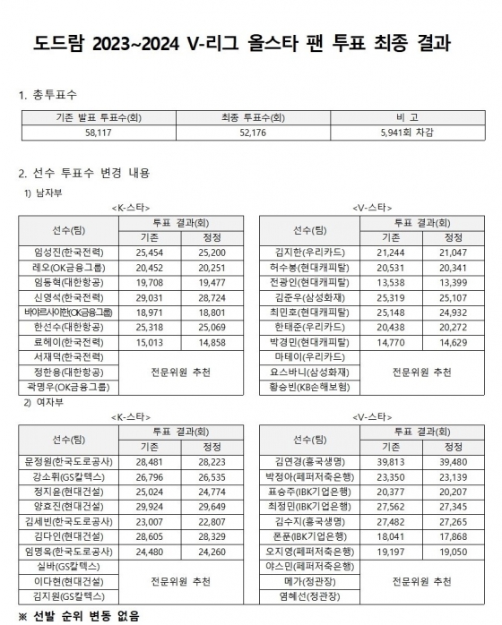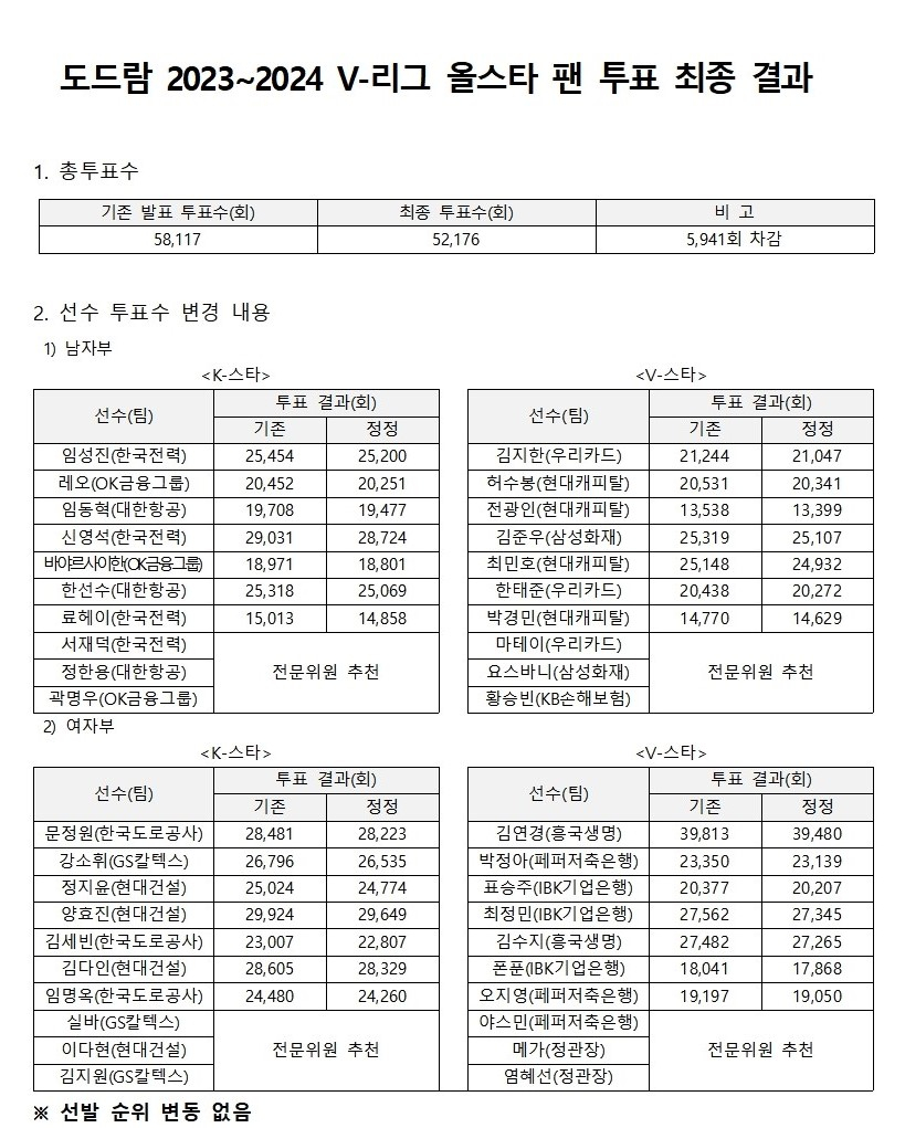 연맹은 14일 "지난 12월 5일(화)부터 11일(월)까지 7일 동안 진행된 도드람 2023~2024 V-리그 올스타 팬 투표에서 이뤄진 부정 투표를 추가 확인했다. 이에 건전하고 공정한 팬 투표 문화 조성을 위해 부정 투표를 근절해 나갈 계획이다"라고 밝혔다.