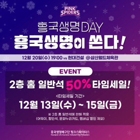 흥국생명 팬들을 위한 할인 이벤트도 마련돼 있다. 13일부터 15일까지 3일 동안 2층 홈 일반석 50% 할인가에 구매할 수 있도록 했다.