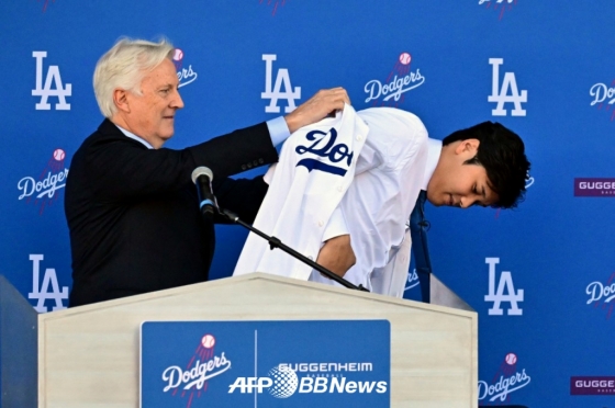 마크 월터(왼쪽) LA 다저스 구단주가 오타니 쇼헤이에게 유니폼을 입혀주고 있다. /AFPBBNews=뉴스1