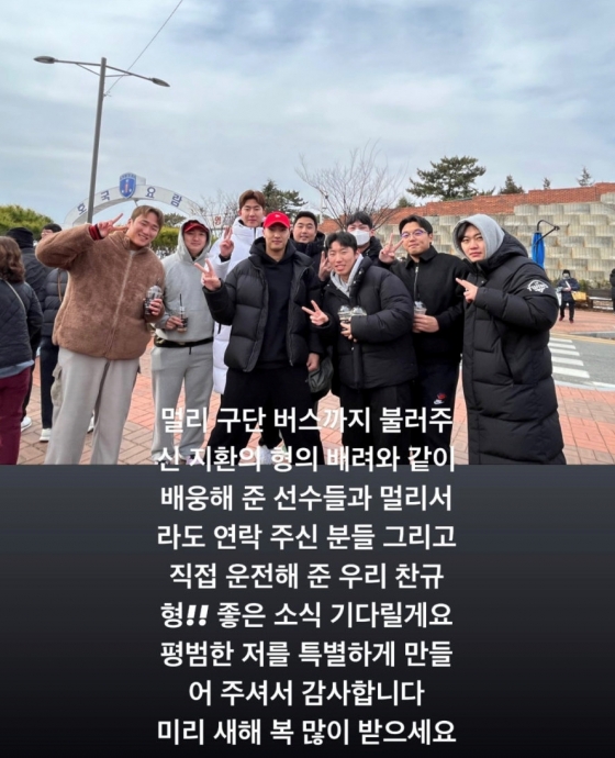 훈련소로 가는 길은 쓸쓸하지 않았다. LG 트윈스 캡틴 오지환을 비롯해 고우석, 김윤식, 박명근, 이우찬, 이상영, 김영준 등 10여명이 논산훈련소 정문까지 배웅을 해줬기 때문이었다. 또 그런 이정용과 함께 현재 FA(프리에이전트) 신분인 임찬규는 직접 운전하며 논산훈련소까지 함께했다.