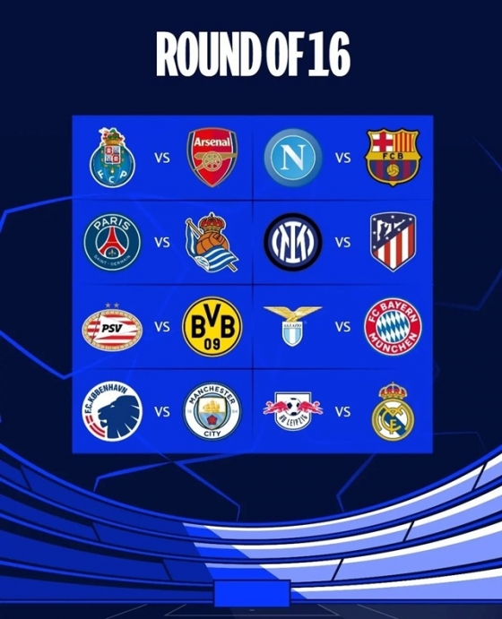 또 바르셀로나는 김민재의 전 소속 팀 나폴리(이탈리아), '명장' 디에고 시메오네 감독의 아틀레티코는 인터밀란을 상대한다. 도르트문트는 PSV아인트호벤(네덜란드)과 8강 티켓을 놓고 맞붙고, RB라이프치히(독일)는 레알과 운명의 대결을 펼친다.