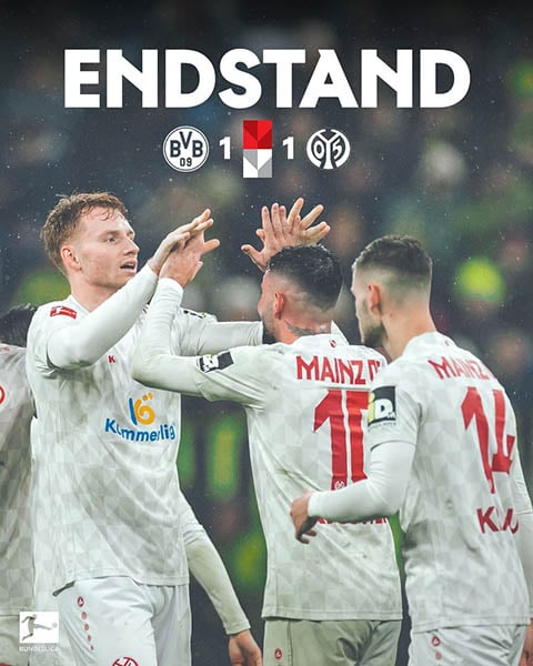 두 팀은 후반전에 모두 득점에 성공하지 못하면서 경기는 1-1로 마무리됐다. 도르트문트를 상대로 승점 1점을 챙긴 마인츠는 강등권에서 벗어났다. 마인츠는 1승 7무 8패(승점 10)로 리그 15위에 올랐다.