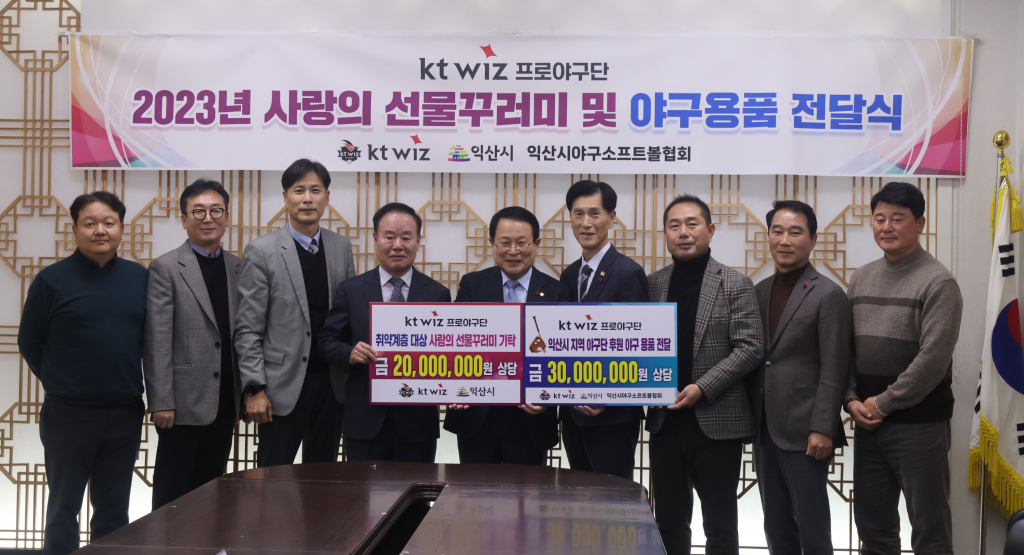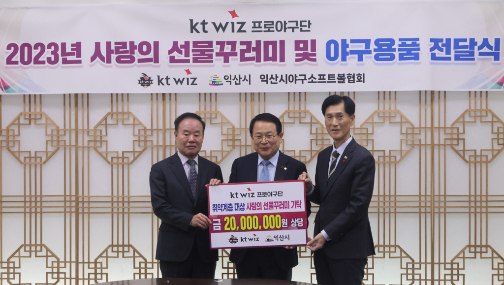 이날 행사에는 정헌율 익산시장, 이호식 kt sports 대표이사, 엄양섭 익산시자원봉사센터 이사장, 나도현 단장, 이선호 익산시 야구소프트볼협회장 등이 참석해 나눔에 의미를 더했다.