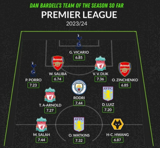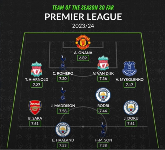 손흥민(31·토트넘 홋스퍼)은 공격수 부문에 이름을 올렸다. 엘링 홀란(맨체스터 시티)과 투톱을 이뤘다. 이밖에도 제레미 도쿠와 로드리(이상 맨시티), 제임스 매디슨(토트넘)과 부카요 사카(아스널)가 선정됐다. 포백에는 비탈리 미롤렌코(에버튼), 버질 판 다이크와 트렌트 알렉산더 아놀드(이상 리버풀), 크리스티안 로메로(토트넘)가 올랐다. 골키퍼는 안드레 오나나(맨체스터 유나이티드)였다.