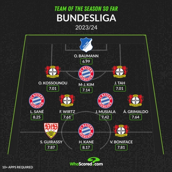분데스리가 1위를 달리고 있는 바이어 04 레버쿠젠과 2위 뮌헨 선수들이 대거 포진했다. 해리 케인, 자말 무시알라, 르로이 사네, 김민재가 베스트 11에 올랐다. 레버쿠젠에서는 빅터 보니페이스, 알렉스 그리말도, 플로리안 비르츠, 조나탄 타, 오딜롱 코소누(이상 레버쿠젠) 5명이 선정됐다. 17골을 기록 중인 세루 기라시(VfB슈투트가르트)와 골키퍼 올리버 바우만(TSG 1899 호펜하임)이 남은 두 자리를 차지했다.