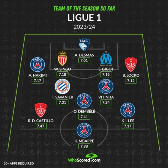 같은 날 프랑스 리그1 베스트 11도 공개됐다. 이강인(파리 생제르망)은 왼쪽 미드필더로 이름을 올렸다. 평균 평점 7.17로 호평받았다. 팀 동료인 킬리안 음바페, 우스만 뎀벨레, 비티냐, 아슈라프 하키미(이상 파리 생제르망)도 선정됐다. 음바페가 7.98로 최고 평점을 받았다. 2023~2024시즌 프랑스 리그1 18골로 2위 비삼 벤 예데르(8골)를 크게 앞서고 있다. 소속팀도 17경기를 치른 현재 리그 1위다.