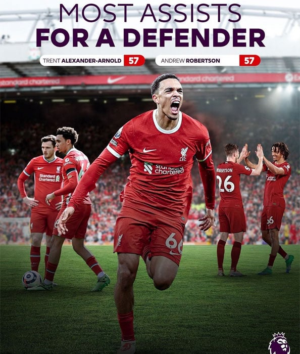 아놀드는 아직도 25살이며 다른 프리미어리그 수비수들이 결코 깨지 못할 기록을 세울 것으로 보인다. 그는 214경기에서 57개의 어시스트를 기록했으며, 로버트슨은 260경기에서 같은 기록을 달성했다.