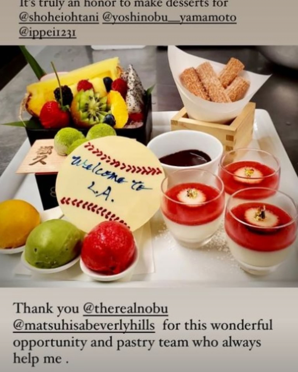 이 매체는 노부 마츠히사의 소셜네트워크서비스(SNS) 계정을 인용, "전 세계적으로 유명한 이 스시(생선회) 레스토랑은 지난 토요일(현지 시각 23일) 특별 손님인 오타니와 야마모토, 그리고 통역 미즈하라 잇페이(39)를 위해 모든 수단을 동원하며 맛있는 식사와 특별한 디저트를 대접했다.(The world-famous sushi restaurant pulled out all the stops for its special guests, treating Ohtani, Yamamoto and interpreter Ippei Mizuhara to an array of delectable desserts)"고 설명했다. 이어 MLB.com은 "오타니와 야마모토는 LA 다저스와 초대형 계약을 맺은 뒤 유대감을 쌓기 위해 노력하고 있다. 축하할 만한 가치가 있다"고 덧붙였다.