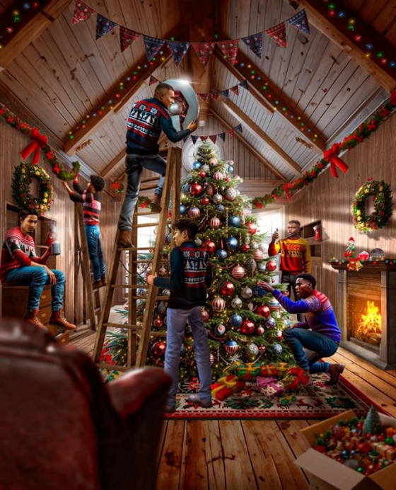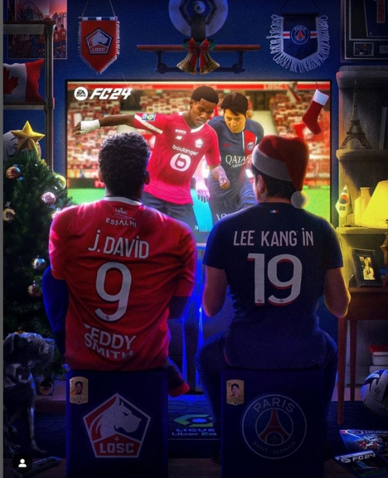 포스터에는 산타 모자를 쓴 이강인이 조나단 데이비드(릴)과 함께 크리스마스 트리로 꾸며진 집에서 게임 FC24를 즐기는 모습이 담겼다.