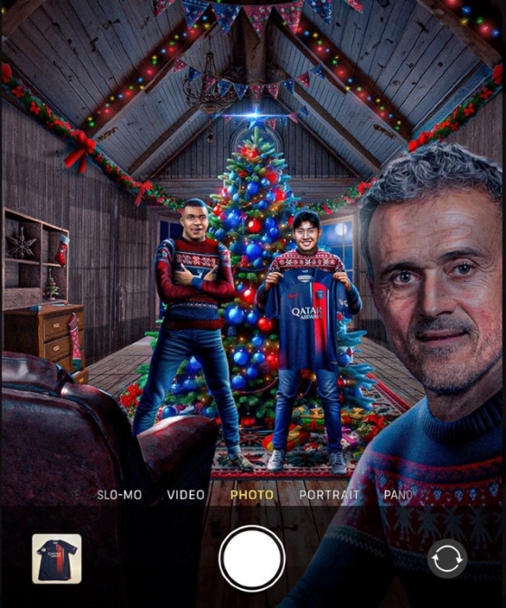 또 다른 포스터에는 이강인이 팀 동료 킬리안 음바페와 나란히 크리스마스 트리 앞에서 포즈를 취하고 있다. 음바페는 자신의 시그니처 세리머니인 양손을 겨드랑이에 낀 모습이다. 이강인은 PSG 유니폼을 들고 환하게 웃고 있다. 루이스 엔리케 감독의 모습도 보인다. 엔리케 감독이 휴대폰 셀카 모드로 두 선수를 찍은 설정이다.