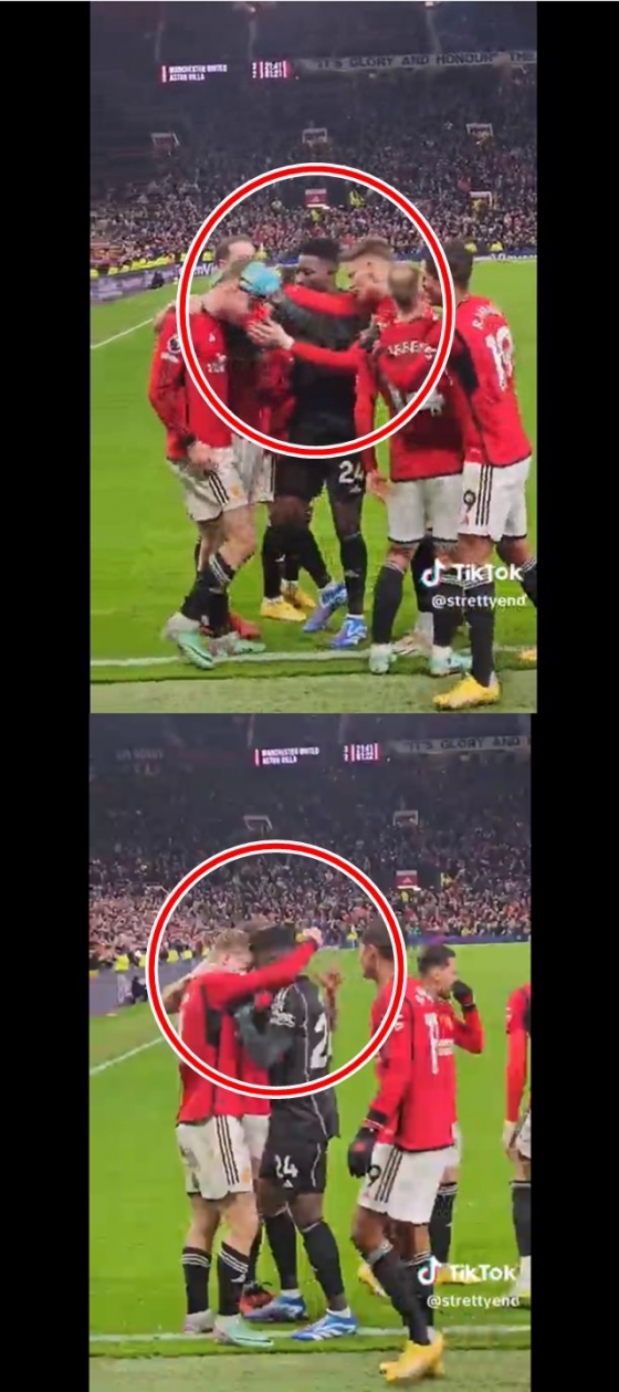 그런데 골키퍼 오나나가 깜짝 등장했다. 너무 기쁜 나머지 100m가 넘는 거리를 전력 질주해 세리머니를 함께한 것이다. 오나나가 나타나자 맨유 베테랑 수비수 조니 에반스도 놀란 표정을 지었다. 오나나는 회이룬을 끌어안으며 격하게 축하했다.
