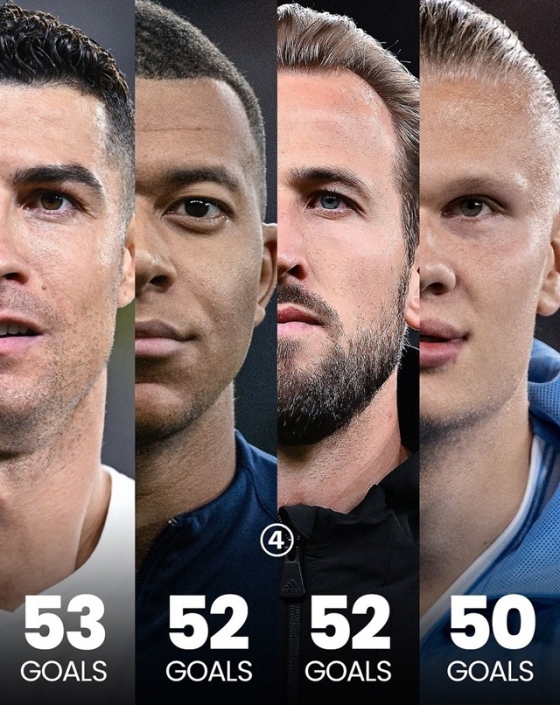 호날두는 나이가 한참 어린 후배들도 제쳤다. 호날두의 뒤를 이어 킬리안 음바페(25·파리 생제르맹), 해리 케인(30·바이에른 뮌헨)이 52골씩, '괴물 공격수' 엘링 홀란드(23·맨체스터 시티)가 50골을 기록 중이다.