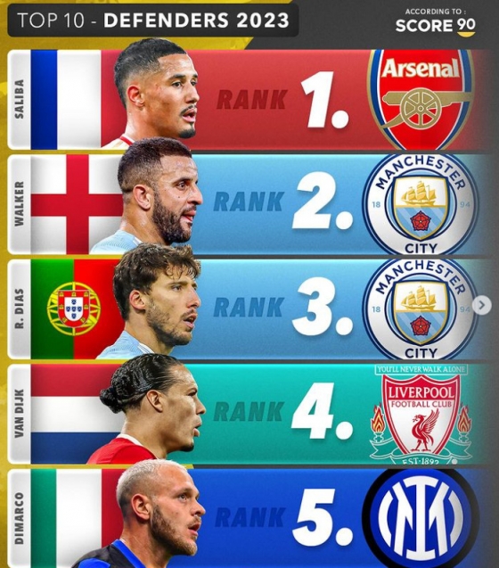 1위부터 4위까지 잉글리시 프리미어리그(EPL) 소속 선수들이 차지했다. 1위는 윌리엄 살리바(아스널), 2위 카일 워커(맨시티), 3위 후벵 디아스(맨시티), 4위 버질 반 다이크(리버풀), 5위 페데리코 디마르코(인터밀란)로 나타났다.