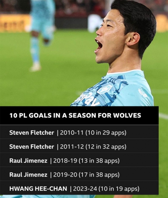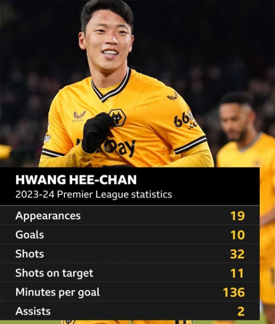 영국 매체 ‘BBC’는 29일(한국 시간) “통계로 보여지는 것 중 하나는 황희찬이 이번 시즌 골 수 대비 유효슈팅이 가장 적다. 이는 유효슈팅 대비 득점률이 높다는 것을 의미한다”라고 보도했다.