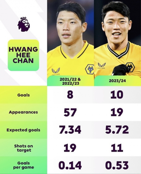 PL 사무국에 따르면 황희찬은 2021/22시즌과 2022/23시즌 57경기에 나섰지만 합쳐 8골에 그쳤다. 반면 이번 시즌엔 19경기에 출전해 10골을 넣었다.