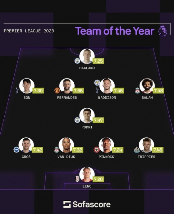 축구 통계 매체 ‘소파스코어’는 30일(한국 시간) SNS를 통해 2023년 PL 올해의 팀(Team Of the Year, TOTY)을 공개했다. 매체는 평점을 기반으로 한 베스트 11을 발표했다.
