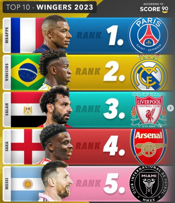 1위는 킬리안 음바페(PSG), 2위 비니시우스 주니오르(레알 마드리드), 3위, 모하메드 살라(리버풀), 4위, 부카요 사카(아스널), 5위 리오넬 메시(인터 마이애미)였다.