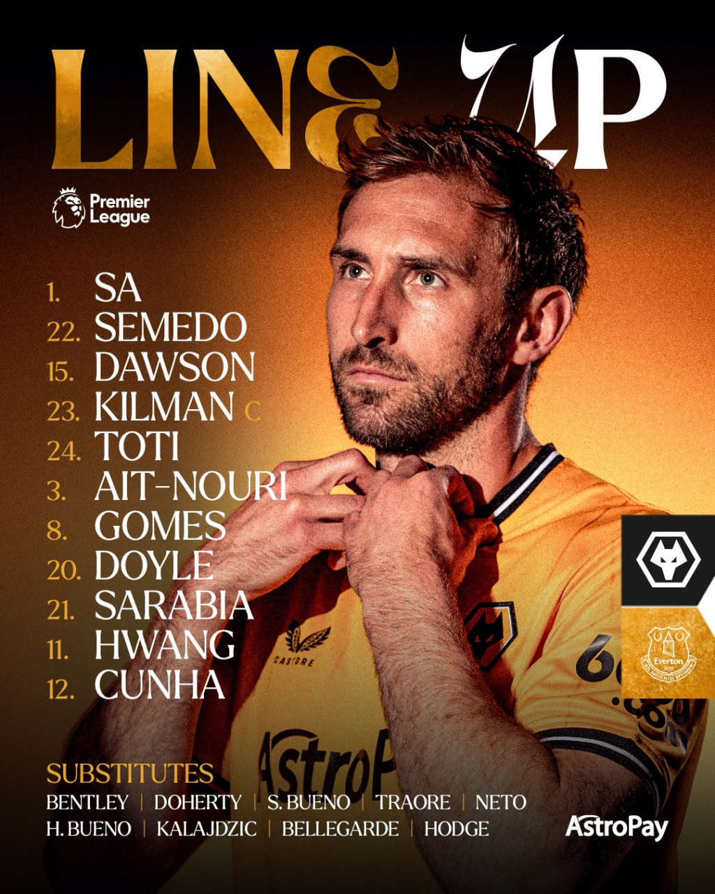 울버햄튼은 3-4-2-1 포메이션으로 나섰다. 최전방에 마테우스 쿠냐, 좌우 측면 공격수에 각각 파블로 사라비아, 황희찬이 섰다. 중원은 아마두 오나나와 제임스 가너가 형성했고 측면 미드필더에 드와이트 맥닐, 잭 해리슨이 포진했다. 스리백은 크레이그 도슨, 막시밀리언 킬먼, 토티 고메스가 형성했다. 윙백은 아이트 누리, 넬송 세메두가 맡았다. 골키퍼 장갑은 조세 사가 꼈다.