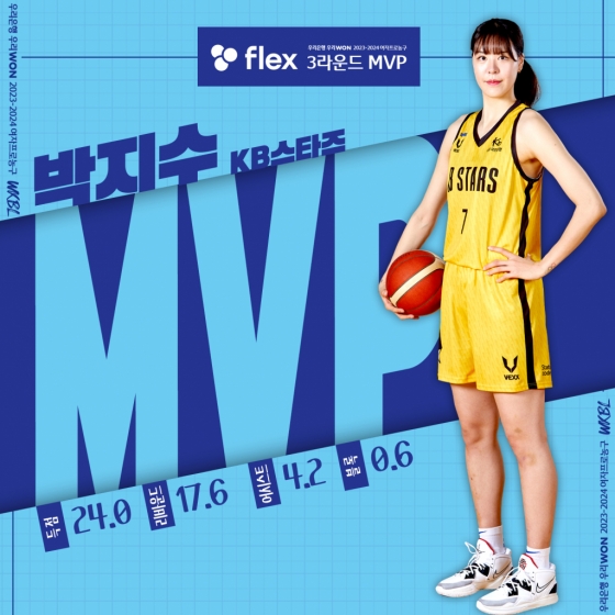 한국여자농구연맹(WKBL)은 2일 '우리은행 우리WON 2023~2024 여자프로농구 flex 3라운드 MVP/MIP' 결과를 발표했다. 3라운드 최우수선수(MVP)는 박지수의 차지로 돌아갔다. 박지수는 상금 200만 원을 받는다.