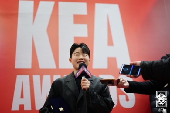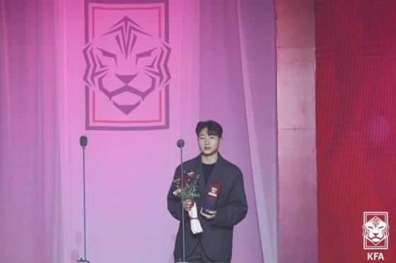 황재원은 "영광스러운 자리에서 상을 받아서 감사하다. 처음 받아서 떨리는데 앞으로 열심히 하고 더 노력하겠다"고 다짐했다. '혼혈선수' 케이시는 한국말로 깜짝 소감을 전했다. 그간 통역을 통해서 인터뷰 했으나 이날만큼은 또박또박 능숙한 한국어를 선보였다. 케이시는 "영광스러운 상을 받아서 감사하다. 한국 대표팀으로 뛸 수 있어서 자랑스럽다. 그 기회를 준 대한축구협회에도 감사하다. 2024년에도 열심히 하겠다"고 말했다.