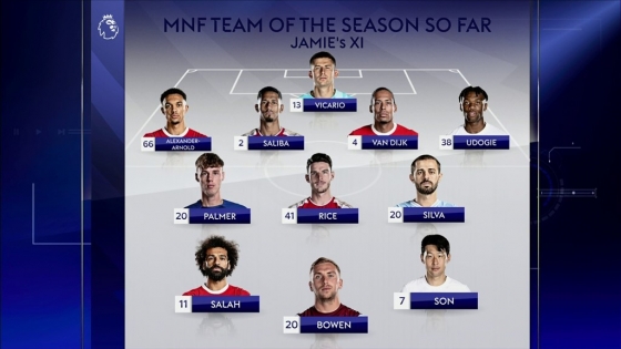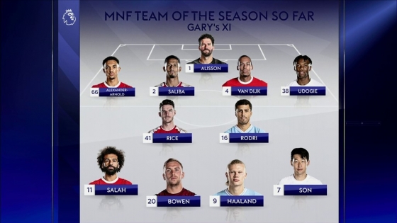네빌과 캐러거는 손흥민과 보웬, 그리고 살라를 공격진에 포함시키는 데 같은 의견을 냈다. 또 데스티니 우도기와 버질 반 다이크, 윌리엄 살리바, 알렉산더-아놀드로 꾸려진 포백에 관해서도 의견 일치를 봤다. 미드필더에서는 데클란 라이스가 2명으로부터 선택을 받았다. 이렇게 네빌과 캐러거는 11명 중 8명을 전반기를 대표한 베스트11로 나란히 꼽은 것. 반면 골키퍼에서는 서로 의견이 엇갈렸으며, 미드필더 역시 두 자리에서 의견이 나뉘었다. 골키퍼로 캐러거는 비카리오를, 네빌은 알리송을 각각 꼽았다. 또 미드필더에서는 캐러거가 콜 파머와 베르나르두 실바를, 네빌은 로드리를 선택하면서 동시에 공격수로 홀란을 선택했다.