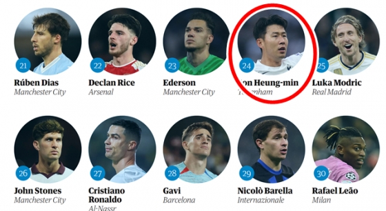 손흥민은 '발롱도르 출신' 루카 모드리치(레알 마드리드·25위), 유럽 트레블 주역 존 스톤스(맨체스터 시티·26위), 슈퍼스타 크리스티아누 호날두(알나스르·27위)보다도 높은 순위를 기록했다. 토트넘 선수 중에서도 가장 높은 순위였다. '새로운 파트너' 제임스 매디슨이 77위, 센터백 크리스티안 로메로가 88위에 자리했다.