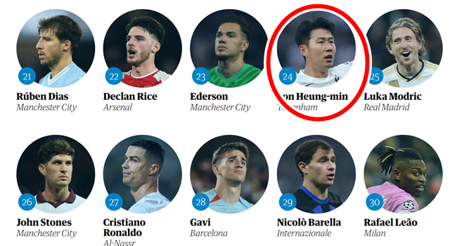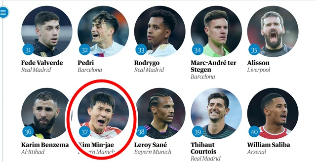 스포츠전문 스코어90은 6일(한국시간) 영국 더 가디언이 선정한 2023년 베스트 플레이어를 소개했다. 스코어90은 톱 30위 안에 든 선수만 공개했지만, 지난 달 가디언은 1위부터 100위까지 총 100명의 선수를 발표한 바 있다. 이 가운데 한국 선수가 둘이나 들어갔다. 공격수 손흥민은 24위, 김민재는 37위에 이름을 올렸다.