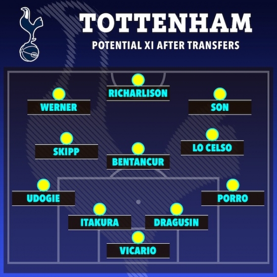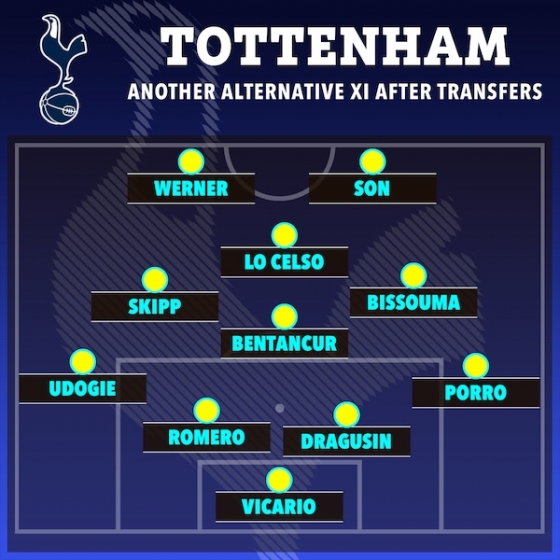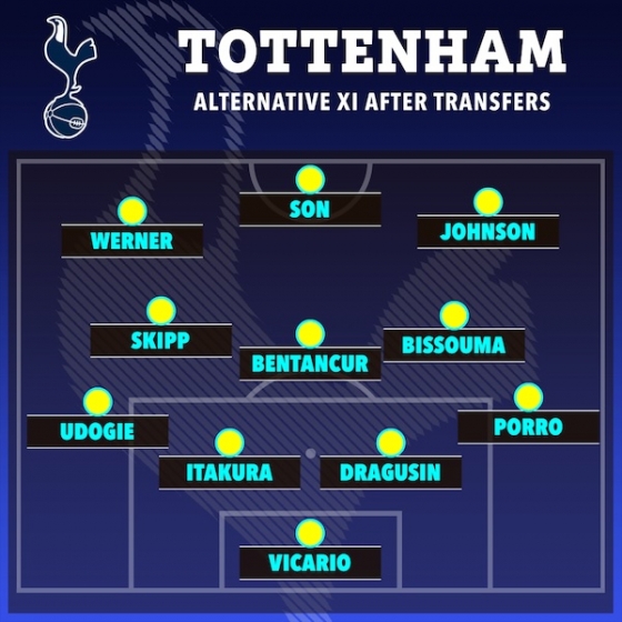 ‘더선’은 기존 토트넘 선수들에 더해 최근 토트넘과 연결되는 선수들로 구성된 라인업을 공개했다. 손흥민을 비롯해 이브 비수마, 페드로 포로 등 입지가 좋은 주전 자원은 그대로였으나 변화가 있었다.