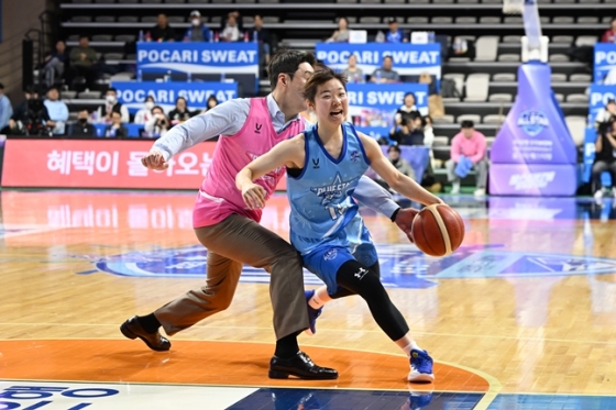 '맏언니' 격인 김정은이 먼저 '호통'을 시작했다. 1쿼터에 박지현(우리은행)과 위성우 우리은행 감독의 1대1 대결이 펼쳐졌다. 다른 선수들은 코트 사이드로 빠져 둘만의 시합을 만들어줬다. 구두를 신고 코트에 오른 위성우 감독이 공격을 시도했지만 박지현에게 바로 스틸을 당했다. 이어 3점포를 시도했지만 에어볼로 망신을 샀다.