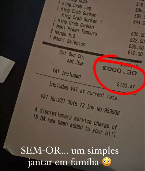 900파운드는 일반 가정에 많은 돈이 될 수 있지만, 실바의 기준으로 볼 때, 그것은 저녁 외출을 위한 가장 많은 돈이 아니다. 특히 실바와 그의 가족이 먹은 노비코프 식당은 한 명당 50파운드(약 8만 원)의 최소 주문을 요구한다.