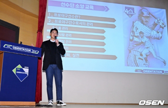 박용택 해설위원은 9일 대전시 컨벤션 센터에서 열린 2024 KBO 신인 오리엔테이션에서 선수단 소양 교육의 강사로 나서 프로선수로서 관리해야 할 것과 목표와 계획, 실천의 중요성에 대해 후배들에게 교육했다.