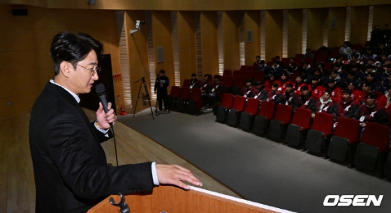 프로야구 선수란 무엇인지 설명한 그는 프로로서 몸 관리 필요성과 그 방법에 대해 조언했다. 이어 주변 사람을 잘 관리해야 한다고 힘줘 말했다.