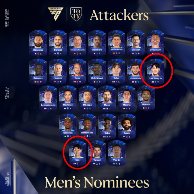 함께 포함된 선수들 면면도 화려하다. 킬리안 음바페(PSG), 엘링 홀란드(맨체스터 시티), 주드 벨링엄(레알 마드리드) 등 월드클래스들이 대거 공격수 부문에 포함됐다. 근 10년 동안 축구계를 양분한 리오넬 메시(인터 마이애미), 크리스티아누 호날두(알 나스르) 등 축구 황제들도 이름을 올렸다. 이강인의 절친이자 마요르카 전 동료 쿠보 다케후사(레알 소시에다드)도 포함됐다.