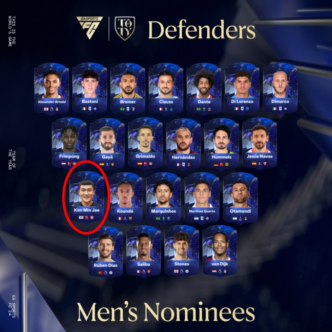 수비수 부문도 현재 축구계를 대표하는 철벽들이 대거 포함됐다. 김민재를 비롯해 후벵 디아스, 존 스톤스(이상 맨시티), 버질 반 다이크(리버풀) 등이 수상을 다툰다. 지난 시즌 나폴리의 리그 33년 만의 우승 주역이었던 김민재는 독일 명가 바이에른 뮌헨으로 이적해 맹활약을 이어가고 있다. 올 시즌 리그 전 경기에 선발 출전하며 토마스 투헬 감독의 두터운 신임을 받고 있다.