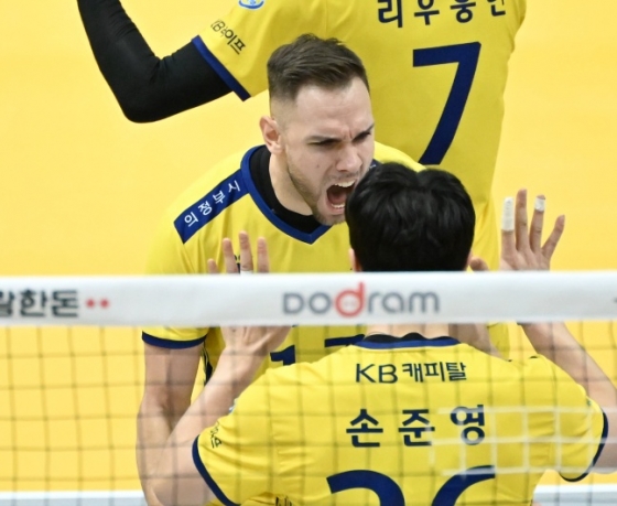 KB손해보험은 9일 경기도 의정부의 의정부실내체육관에서 열린 도드람 2023~2024 V리그 남자부 정규시즌 4라운드 홈 경기에서 대한항공에 3-1(25-14, 29-27, 14-25, 25-22)로 승리했다.