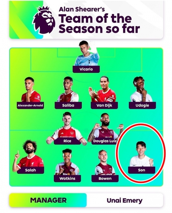 시어러가 뽑은 4명의 공격수는 올 시즌 최고의 모습을 보여주고 있다. 손흥민의 활약도 엄청나다. 안제 포스테코글루 신임 토트넘 감독 체제에서 캡틴 완장까지 달고 있고, 그라운드 안에서는 매서운 골 폭풍을 몰아쳤다. 손흥민은 리그 20경기에 출전해 12골 3도움을 기록했다. 팀에서 가장 많은 골을 터뜨렸다. 또 득점 부문 리그 공동 3위에 올라 다시 한 번 득점왕에 도전한다. 잉글랜드 공격수 도미닉 솔란케(12골)가 손흥민과 같은 12골을 기록 중이다. '괴물 공격수' 엘링 홀란드(맨시티), 살라가 14골로 득점 공동 선두에 올랐다.