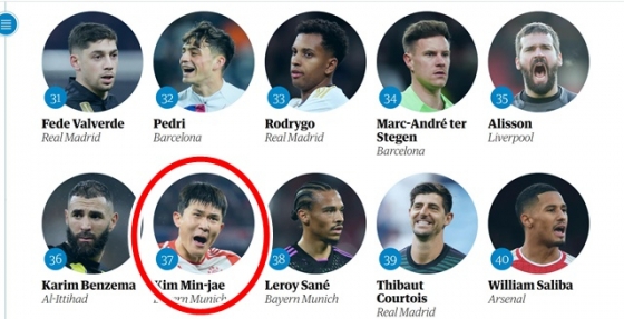 한편 영국 가디언도 지난 달 2023년 한 해 동안 최고의 활약을 펼친 선수 총 100명을 뽑아 1위부터 100위까지 발표했다. 이 가운데 한국 선수가 둘이나 들어갔다. 공격수 손흥민은 24위, 수비수 김민재(바이에른 뮌헨)는 37위에 뽑혀 활약을 인정받았다.