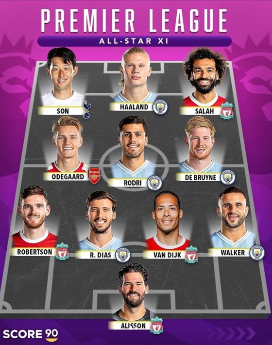 손흥민, 홀란, 살라 스리톱에 이어 마틴 외데가르드(아스널), 로드리, 케빈 데 브라이너(이상 맨시티)가 미드필더에 들어갔다. 포백은 왼쪽부터 앤디 로버트슨(리버풀), 후벵 디아스(맨시티), 버질 반 다이크(리버풀), 카일 워커(맨시티)였다.