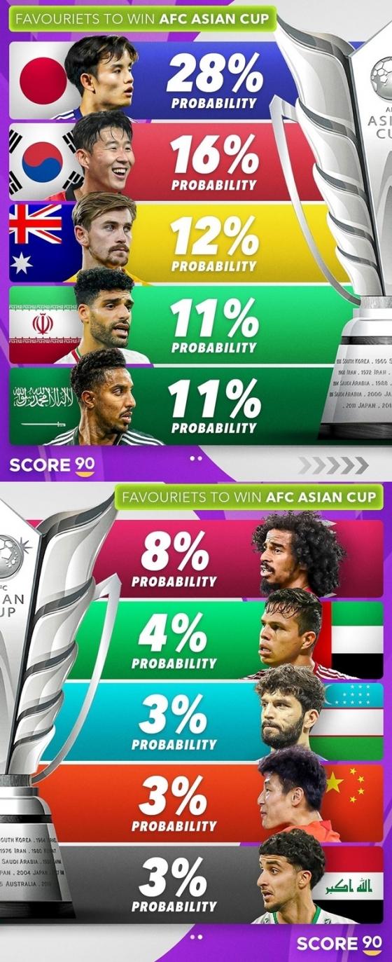 스포츠전문 스코어90은 지난 10일(한국시간) "이번 주부터 2023 카타르 아시안컵이 시작된다. 베트365(스포츠 베팅업체)의 확률을 바탕으로 우승 가능성이 있는 10팀을 소개한다"고 밝혔다.