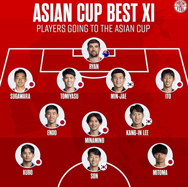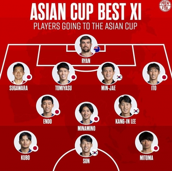 지난 달 스포츠전문 premftbl은 카타르 아시안컵에서 활약할 아시아 스타 11명을 골라 베스트11을 선정했다. 그런데 일본선수는 7명이 뽑혔다. 4-3-3 포메이션으로 베스트11에 들어간 일본 선수는 쿠보 타케후사, 미토마 카오루, 엔도 와타루, 미나미노 타쿠미, 이토 히로키, 토미야스 타케히로, 스가와라 유키나리였다. 한국 선수는 손흥민, 김민재, 이강인 3명뿐이었다. 그만큼 많은 매체들이 일본의 전력을 높게 평가한다는 뜻이다.