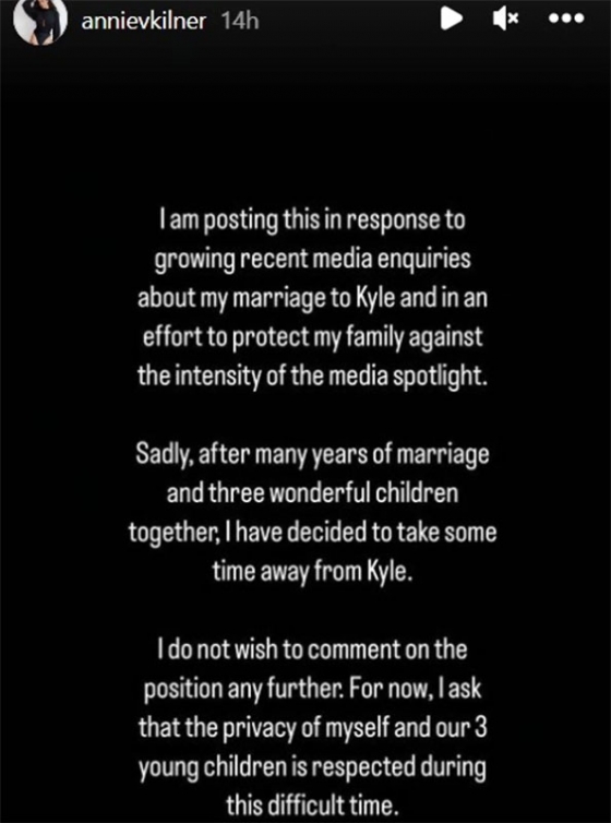 애니는 "슬프게도, 수년간의 결혼생활과 멋진 세 자녀를 함께한 후, 나는 워커에게서 잠시 떨어져 있기로 결정했다. 나는 내 입장에 대해 더 이상 언급하고 싶지 않다. 지금은 이 어려운 시기에 나와 우리 세 자녀의 사생활이 존중되기를 바란다"라고 덧붙였다.